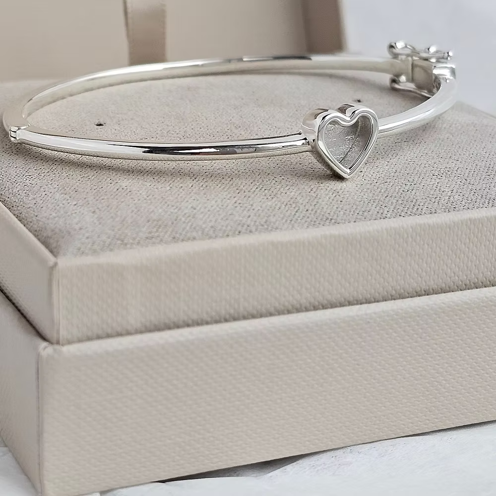 Perfect as a meaningful gift or a versatile addition to your jewellery collection, this sterling silver heart bangle pairs beautifully with charm accents and complementary pieces, making it a timeless accessory for any occasion.