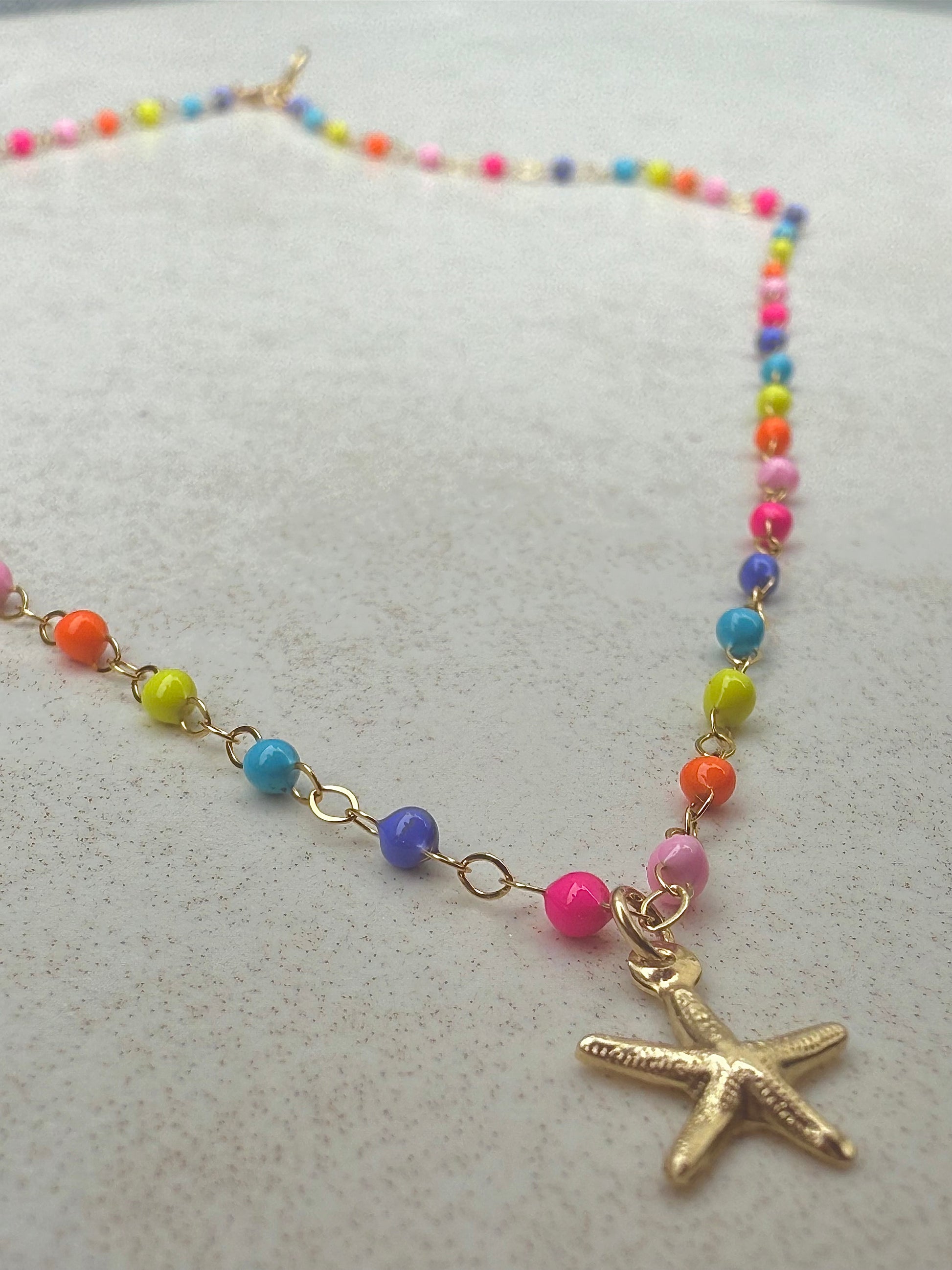 Handcrafted in the heart of the Yorkshire Wolds, our vibrant Rainbow Choker captures the essence of sun-soaked days and cloudless blue skies. Featuring a gleaming 14k Gold-Filled chain adorned with a delicate 14k Gold-Filled Starfish charm, it’s the perfect statement piece to brighten your summer and complete your necklace stack.